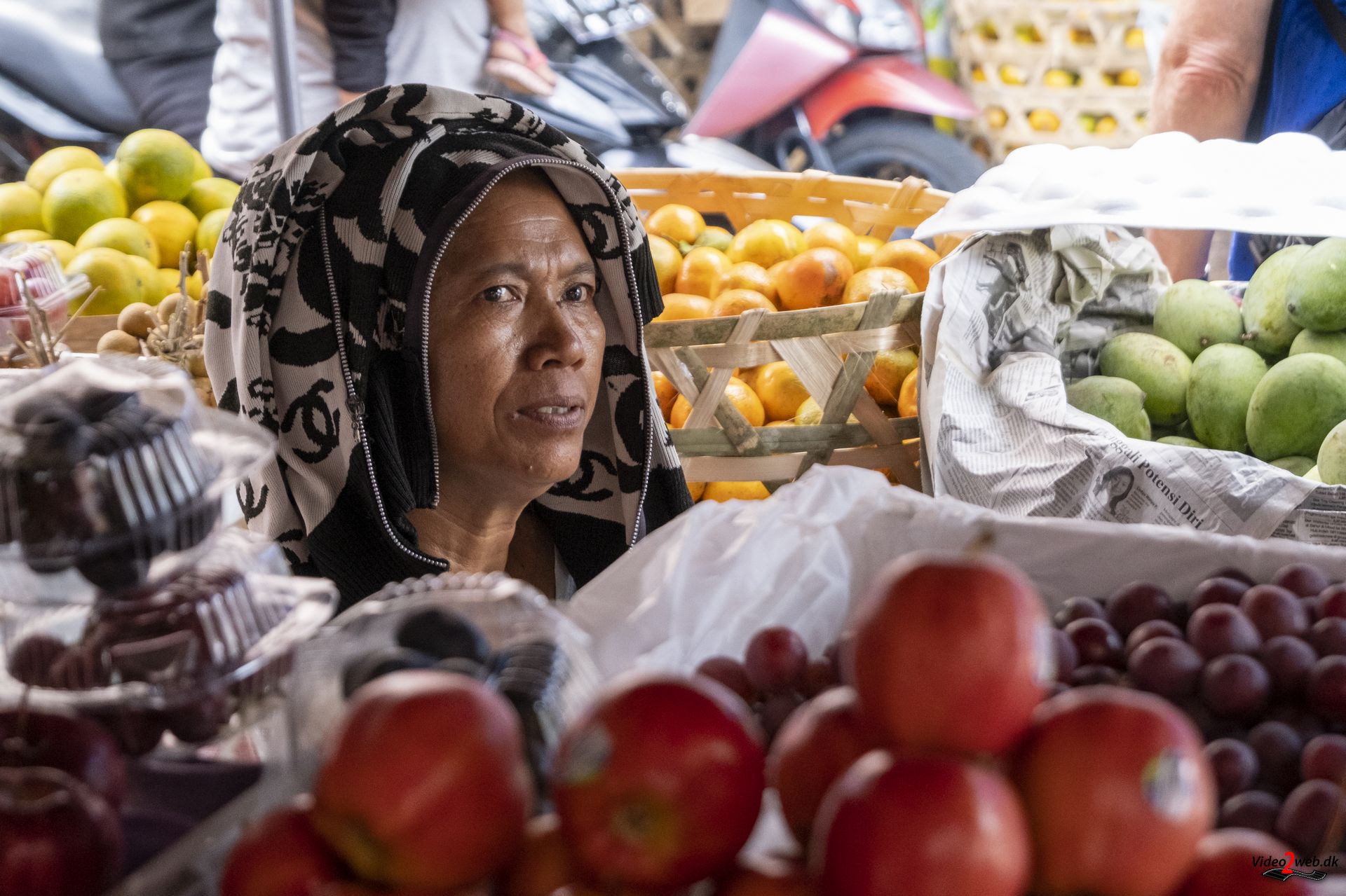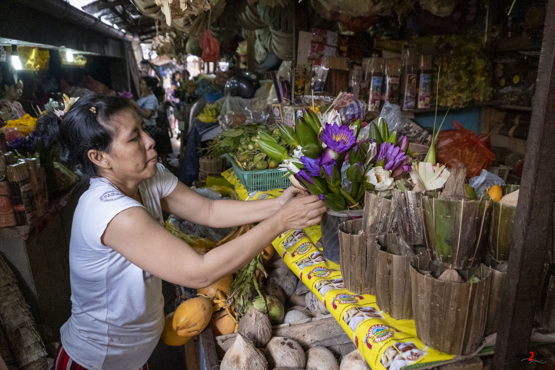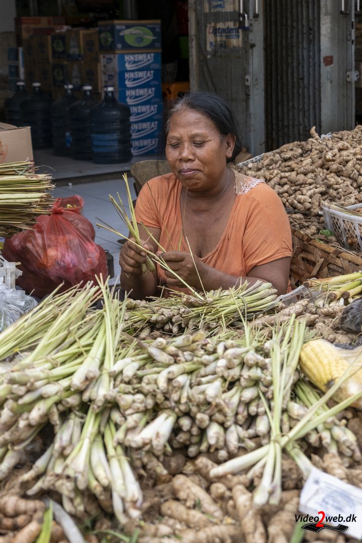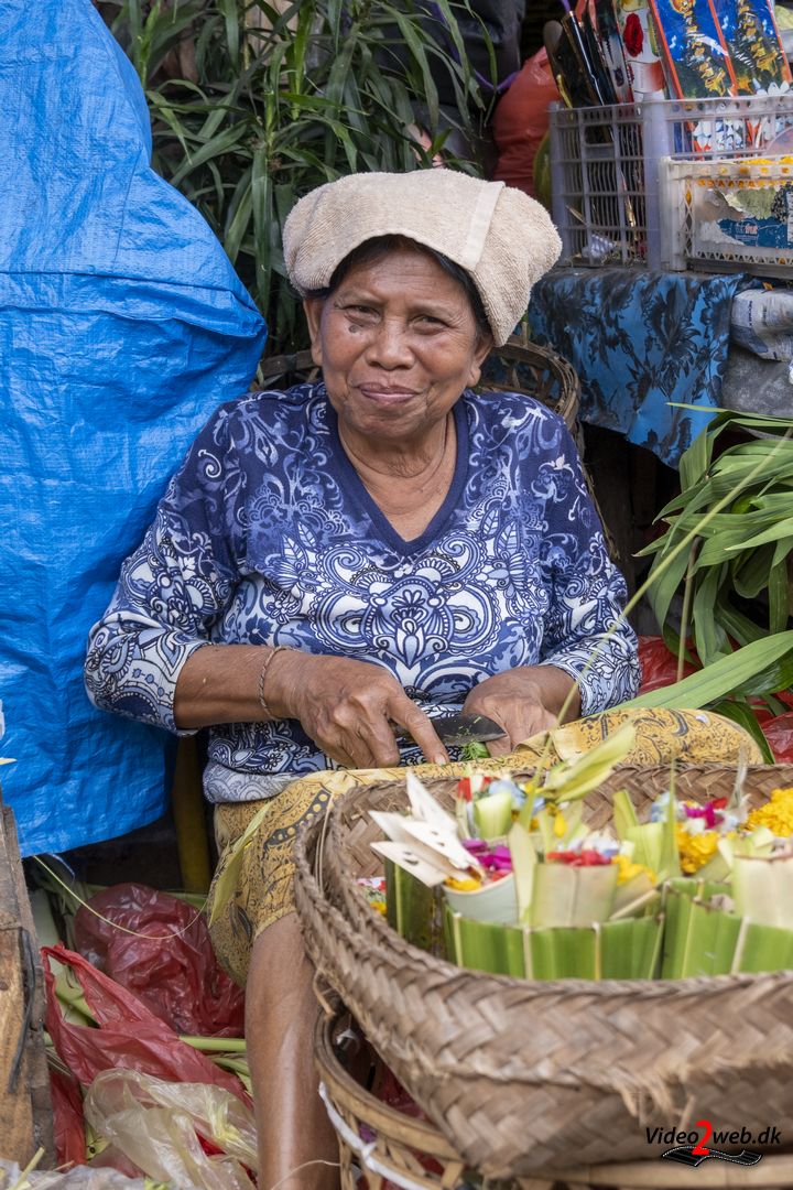 En kvinde forsøger at skabe plads til sin lille æske med offergaver, inden hun sprøjter vievand over – som hun gør tre gange om dagen. Omkring hende kører små motorcykler, handlende med varer og ikke mindst kunder på det store marked i Balis næststørste by, Singaraja.
