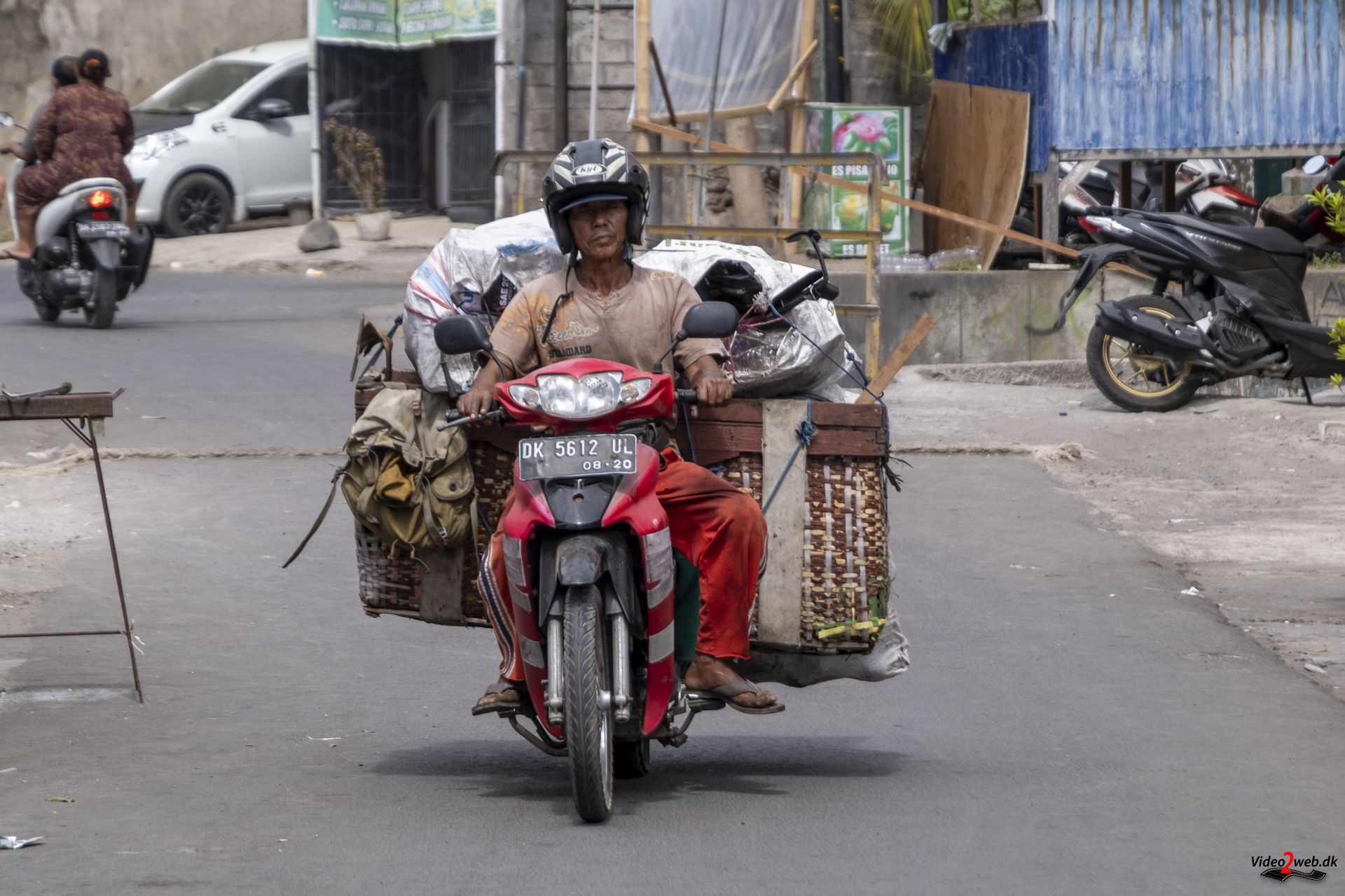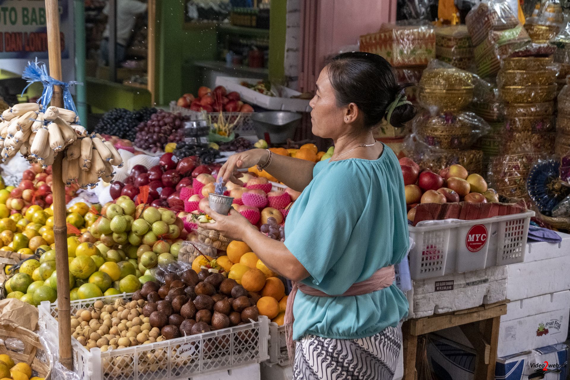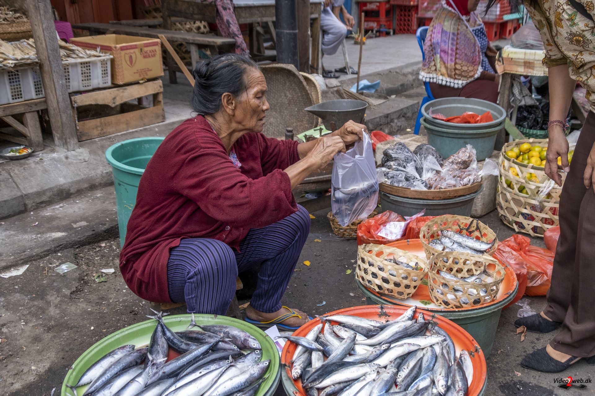En kvinde forsøger at skabe plads til sin lille æske med offergaver, inden hun sprøjter vievand over – som hun gør tre gange om dagen. Omkring hende kører små motorcykler, handlende med varer og ikke mindst kunder på det store marked i Balis næststørste by, Singaraja.