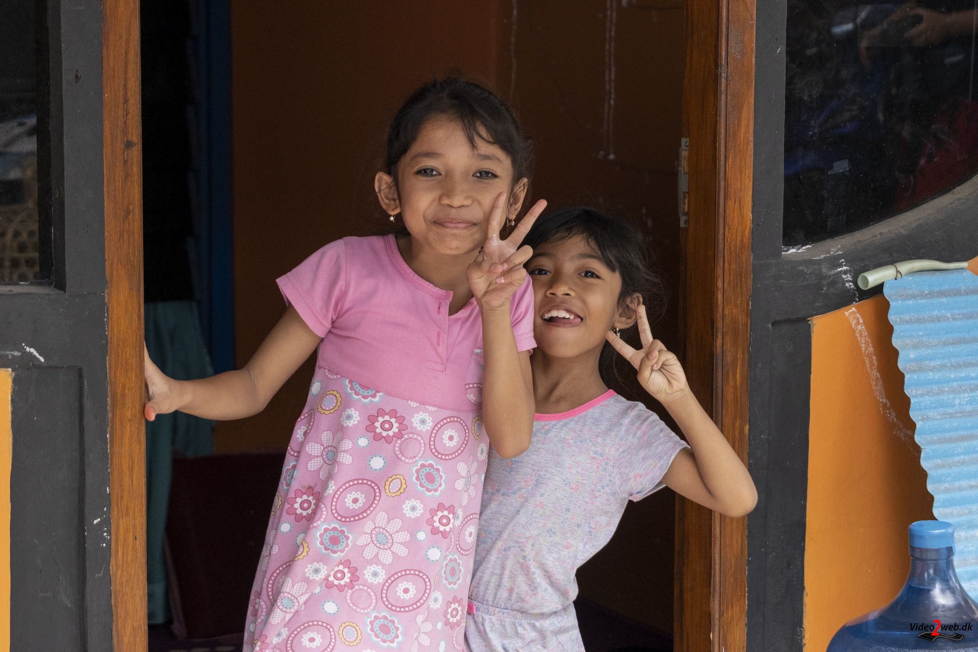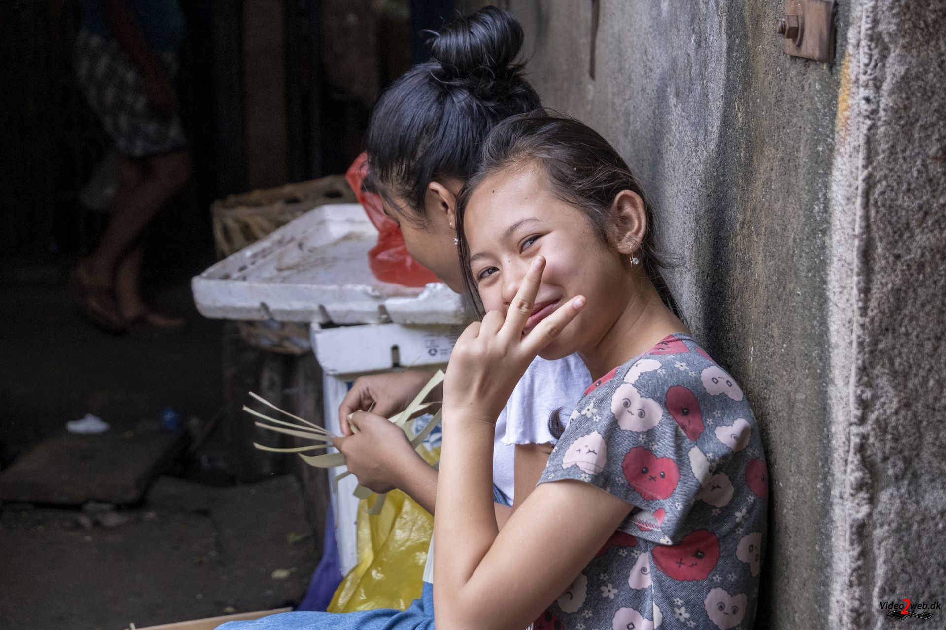 - Smilende pige med v-tegn