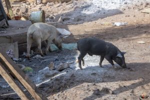 Mellem æselkærrer, geder og lidt overraskende også et par grise indtager de rejsende deres beskedne forkost, inden turen går videre.